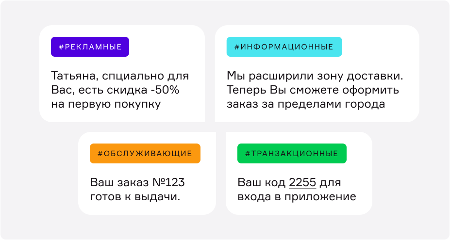 • транзакционные — подтверждают кодом вход на сайт или в приложение, совершение операции, сброс пароля.