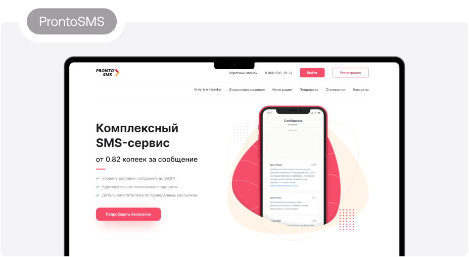 7. ProntoSMS. Платформа работает с рассылками по разным каналам — соцсети, электронная почта, мессенджеры и SMS. Стоимость сообщения — от 82 копеек. Техническая поддержка работает круглосуточно. Есть пробный бесплатный период. Сервис действует с 2012 года не только в России, но и за рубежом. ProntoSMS закрепляет за клиентами персональных менеджеров, предоставляет возможность автоматического редактировании базы и доступ к детальной статистике по выполненной задаче.