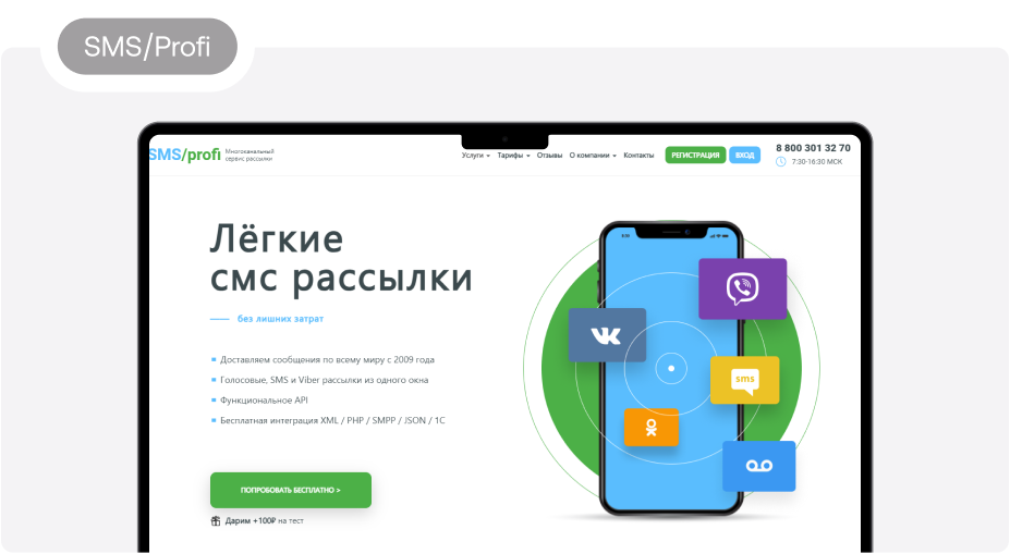 6. SMSProfi Многоканальный сервис, который работает с 2009 года. Агентство предлагает широкий выбор услуг — рассылки, опросы по SMS, таргетированная реклама и не только. При регистрации компания дарит 100 рублей на тестирование функционала. Платформу отличает удобный импорт контактов из файлов разного типа, например, Exсel-таблиц, возможность создания стоп-листов, персонализации текста и использования шаблонов. Доступен предварительный просмотр сообщения с проверкой орфографии. Средняя стоимость одного SMS — от 2,93 рубля.