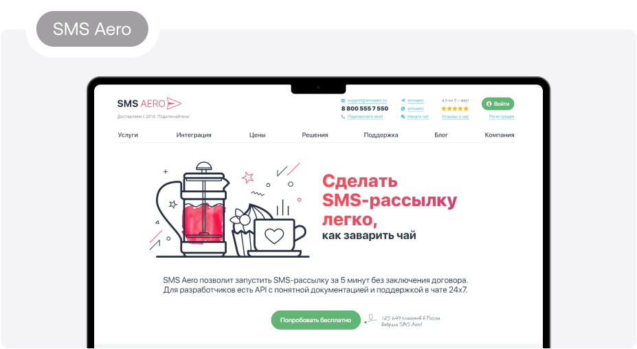 4. SMS Aero. Сервис работает с 2010 года, стоимость SMS — от 1,84 рубля. Уведомления можно рассылать клиентам в разных странах мира, а не только в России. Работает круглосуточная служба поддержки. Клиенты отмечают функциональность сервиса — возможности сегментирования базы, удаления дубликатов, отправки сообщений в определенное время, легкий импорт контактов, готовые решения для разных сфер бизнеса — например, для ритейлеров или интернет-магазинов.