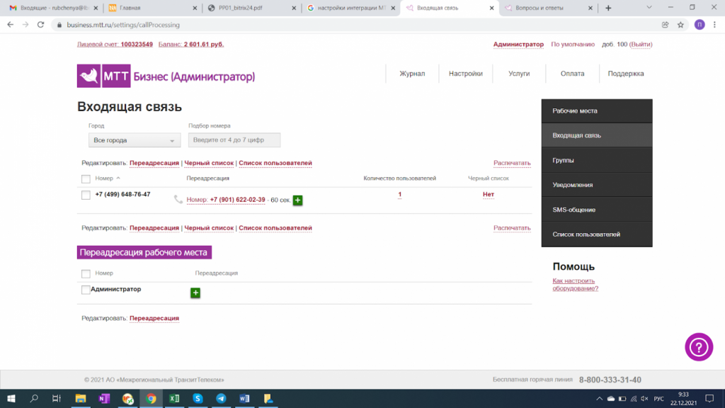 В личном кабинете МТТ отображаются купленные номера, здесь администратор добавляет номера сотрудников и настраивает переадресацию.